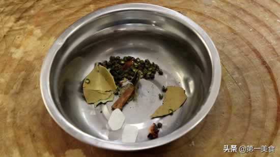 盆中加入少许八角,几片香叶,青花椒5克,桂皮一小段,两块冰糖