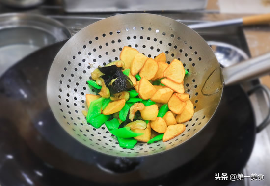 4.地三鲜这道菜好吃但是油大,所以我们再炸的时候要掌握好油温,尽量避免油脂过多的渗入到食材里面。首先我们来炸土豆,油温五成热时,筷子放进去周围都是小气泡就是五成热,把土豆沥干水分放入锅中,用笊篱隔一下以免土豆粘锅经常用炒勺搅动,这样炸出来的土豆颜色更加均匀,将土豆炸出焦边,炸成金黄色捞出来控油。