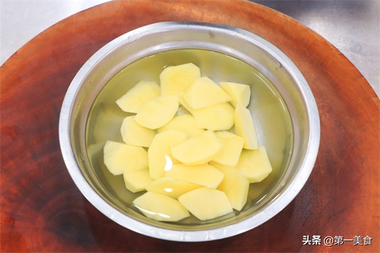 2.把土豆削净外皮切成均匀的滚刀块,放入清水中洗去上面的淀粉,然后换水泡上以免氧化变色。