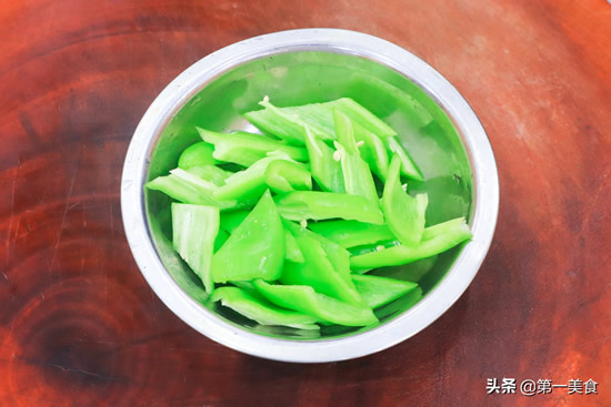 青椒破开把籽去除切成菱形片,切的时候尽量保证青椒、土豆、茄子大小一致,这样成菜比较和谐美观。