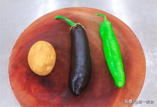 1.首先我们准备食材,土豆、茄子和青椒,最好用紫茄子,青茄子和青椒撞色,搭配起来不好看。