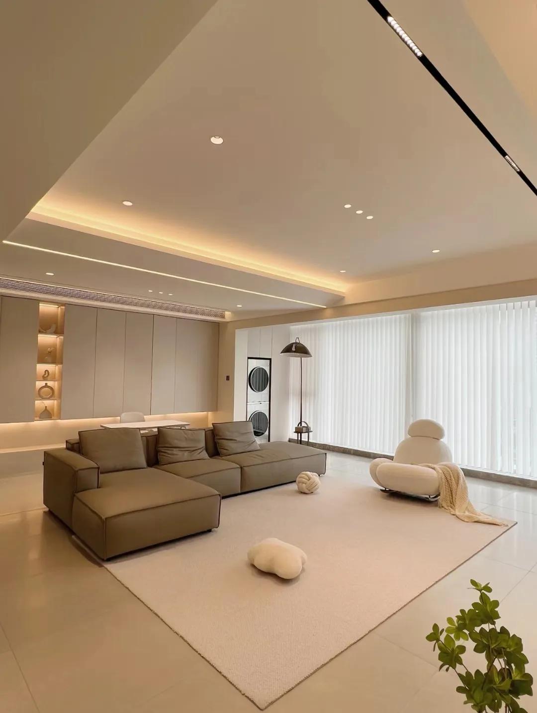 2、客厅布灯的思路,灯光只有打在墙面上,人才会觉得这个空间是明亮的,所以像客厅这种大空间,背景墙的灯光就显得非常的重要,要用线性光源来解决空间基础照度的问题,茶几上方也可以用几个高显指的点光源,其次可以用氛围光来提高质感,比如说窗帘盒的灯光,悬空电视柜下面的灯光,再搭配一些装饰性的落地灯、钓鱼灯,才能够把灯光做出层次
