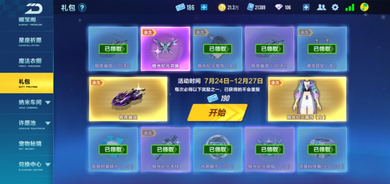 方式二,抽取礼包。用礼包券可以抽取永久A车,礼包券任务、活动会送一些,也可以用点券买。抽取礼包不仅能抽永久A车还能得到一套全新的衣服,太划算了。一般用十万点券就可以将礼包全部抽完,衣服、车子全都能拿到手,礼包的永久A车比工坊的永久A车容易拿多了,也比较稳。因为礼包不存在运气成分,一般永久车都是留在最后一个才能抽到,所以只要你够点券(十万点券),必出永久,而工坊的永久A车运气不好砸20万点券都未必出,所以经历了工坊点券车到最后点券都花完了还是没出永久的亏后,小编现在首选礼包,抽完了礼包,有剩余点券再考虑是否去工坊打造永久车。