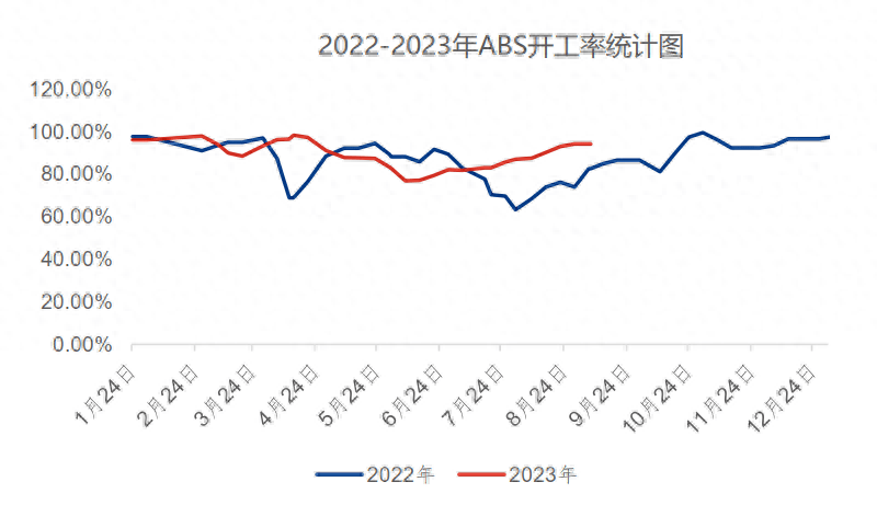 据小八统计:截止2023年8月31日,国内ABS行业总产量为12.85万吨,较前一周稳定,行业开工94.3%,较前一周稳定,上周国内厂家基本维持满负荷运行,ABS整体产能利用率维持高位。