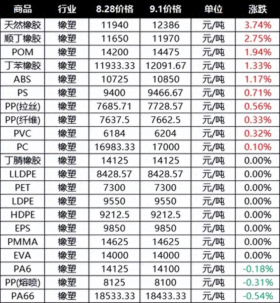 2023年第35周(8.28-9.1)大宗商品价格涨跌榜中橡塑板块环比上升的商品共10种,涨幅前3的商品分别为天然橡胶(3.74%)、顺丁橡胶(2.75%)、POM(1.94%)。