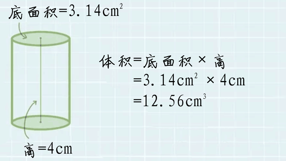 观察图形,我们可以这样理解圆柱体的体积:从圆柱体的底面圆出发,延伸了与圆柱体的高度等长的体积。例如在本例题中,底面积为3.14cm²,高为4cm,计算二者的乘积即可得到圆柱体的体积为3.14cm²x4cm=12.56cm³。