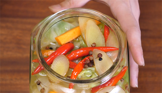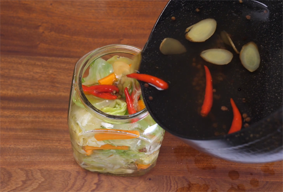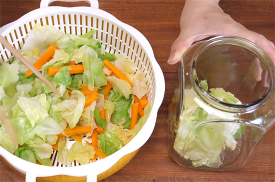 5.晾好的包菜以及胡萝卜将其放在一个无水的玻璃瓶中,然后再倒入晾好的料汁。盖上盖子,腌制一晚上就可以了。