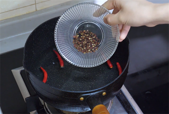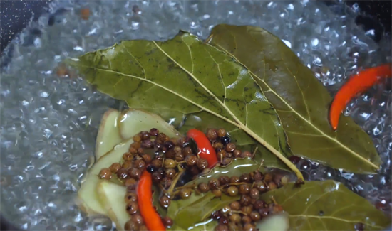 4.准备料汁:炒锅中放适量的凉水,在里面放入小米辣几颗,香叶2片,花椒1小把,精盐10克,将其大火烧开。然后在放入100克白糖,白醋50ml将其搅拌均匀,然后晾晾备用。