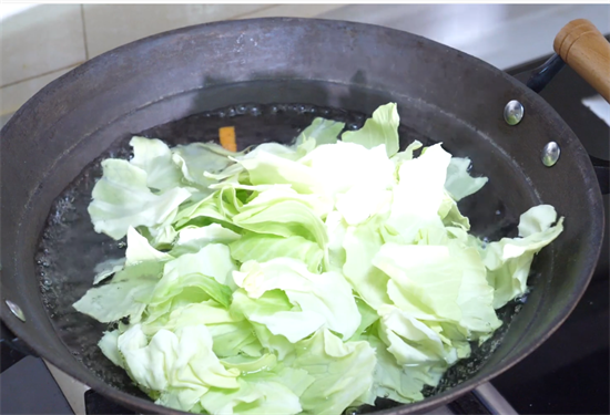 3.炒锅中加入适量的清水大火烧开,水烧开之后准备好的包菜以及胡萝卜放入里面汆烫30秒。30秒之后立即捞出,控干水分备用。