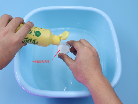 先往水里倒入一瓶盖的洗洁精,洗洁精可以去除油污。