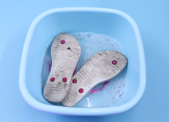 然后把水搅拌均匀,把拖鞋翻过来,放入水里浸泡10分钟左右。