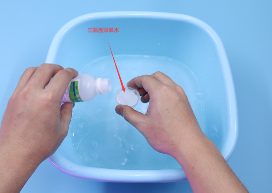 再倒入三瓶盖的双氧水,双氧水可以在药店购买到,几块钱一瓶。双氧水起到的作用是软化污垢。
