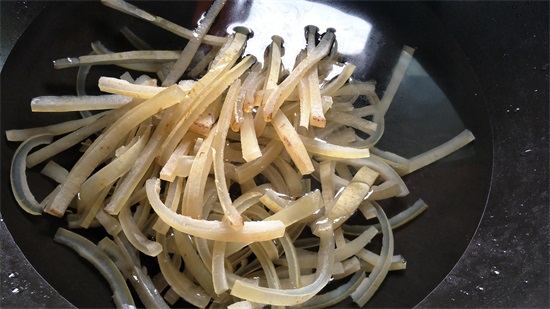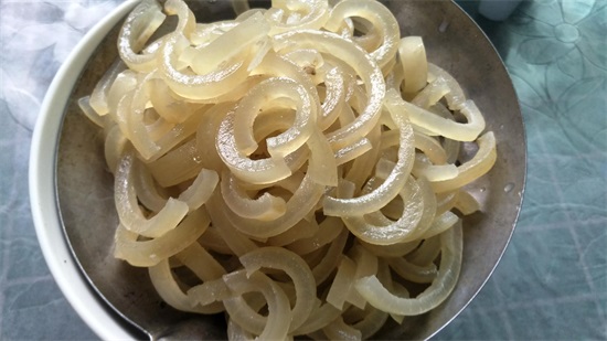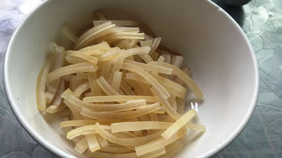1.首先我们准备了300克的猪皮,刮洗干净,切成丝,