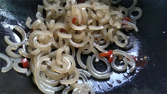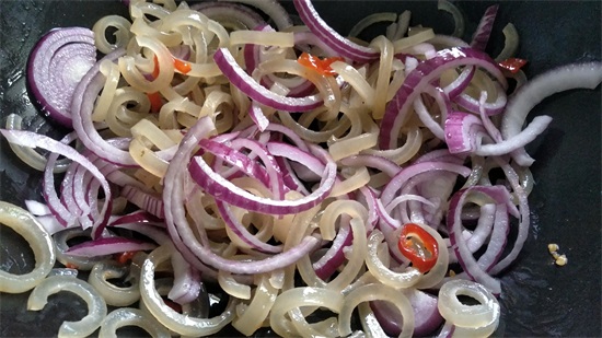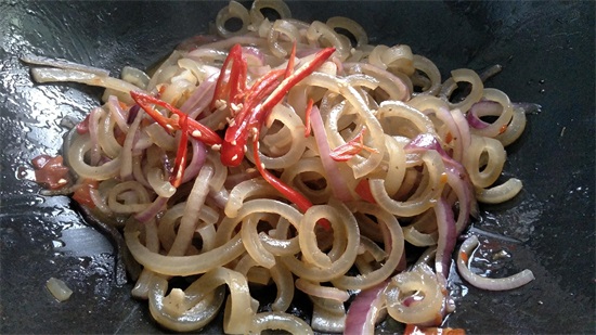 放洋葱翻炒均匀以后再放入小米椒翻炒,