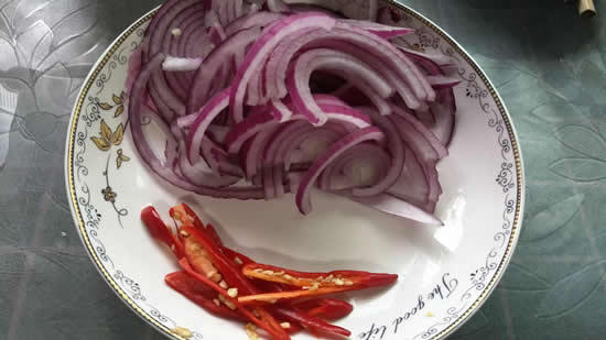 我们再来准备洋葱半个切成丝,小米椒2个也切成丝,