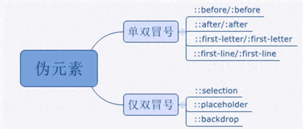 CSS3 规范中的要求使用双冒号 (::) 表示伪元素,以此来区分伪元素和伪类,比如::before 和::after 等伪元素使用双冒号 (::),:hover 和:active 等伪类使用单冒号 (:)。除了一些低于 IE8 版本的浏览器外,大部分浏览器都支持伪元素的双冒号 (::) 表示方法。