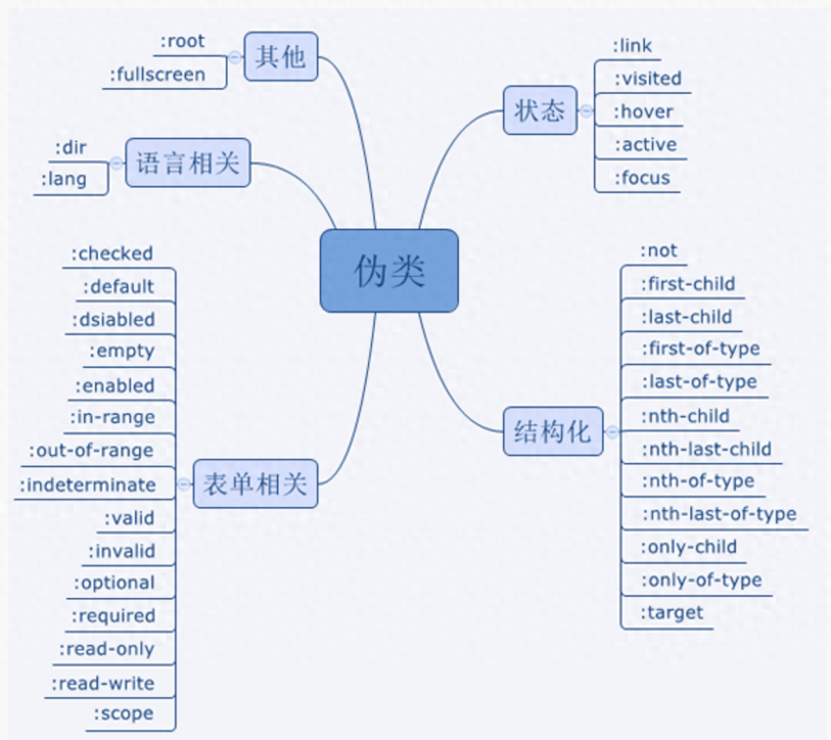 这一章以含义解析和例子的方式列出大部分的伪类和伪元素的具体用法。下面是根据用途分类的伪类总结图和根据冒号分类的伪元素总结图: