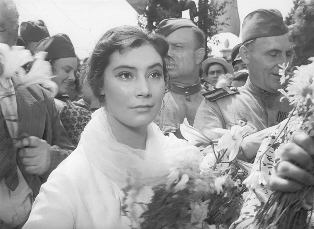 当从战场归来的士兵与恋人们激动地拥吻,只有薇罗尼卡抱着鲜花,流着眼泪穿过汹涌的人潮。