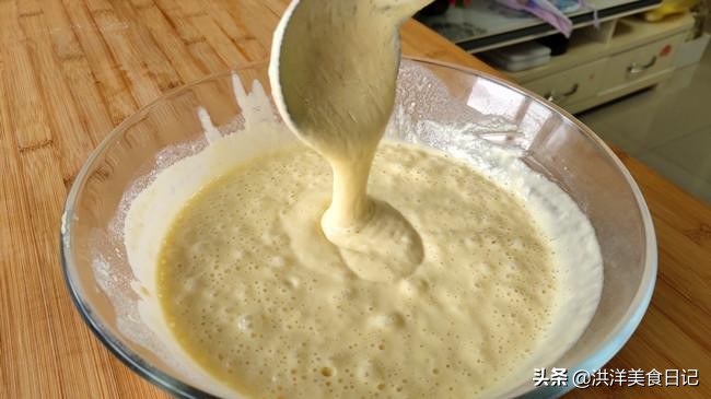 1、首先大碗中倒入100克的细玉米面,200克的白面,3克的酵母,再根据个人的口味加入适量的白糖,爱吃甜的就多加一些,然后加入2克奶粉增加奶香味,不喜欢的也可以不加,再打入1个鸡蛋,然后逐渐的倒入350毫升的温水,如果有条件的话也可以把水换成温牛奶,边倒边搅拌,搅成无干面粉的面糊,然后放到阳光处开始发酵。1个小时左右,面糊的体积明显变大,并且里面有丰富的小气孔,我们将它搅一搅,排排里面的气体。