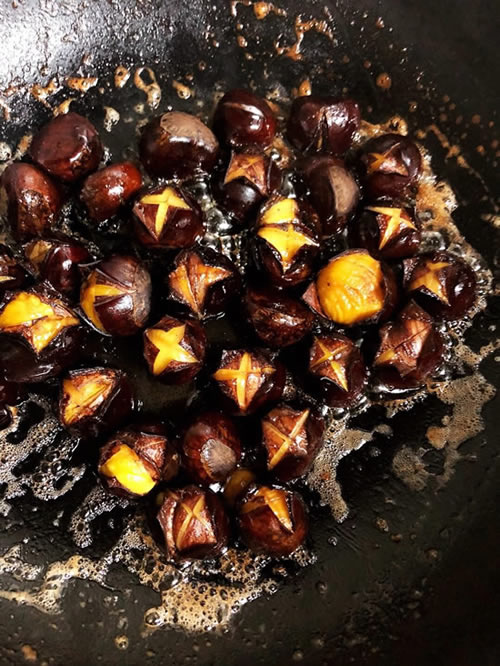 煮熟全裂口了,非常成功,等汁水收的差不多,再用铲子翻拌一下,加速水分的蒸发,最后只留下干燥的板栗即可,一定要小火操作,这样的板栗才好吃。