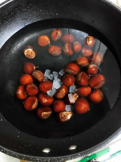 3、起锅烧水,加入板栗、冰糖,加入没过板栗的水,喜欢吃甜的,可以多放一点冰糖。
