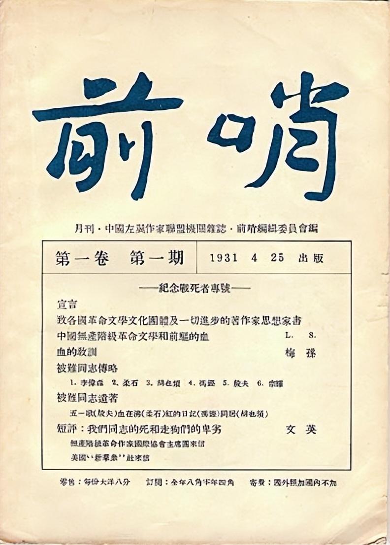 冯雪峰在《回忆鲁迅》中谈到,1931年5月初的某天,他携带刚刚出版的左联刊物《前哨》第一期去访茅盾,恰好遇到了瞿秋白、杨之华夫妇。瞿秋白一读《前哨》上的鲁迅文章《中国无产阶级革命文学和前驱的血》,发出了激赏似的感叹:“写得好,究竟是鲁迅!”