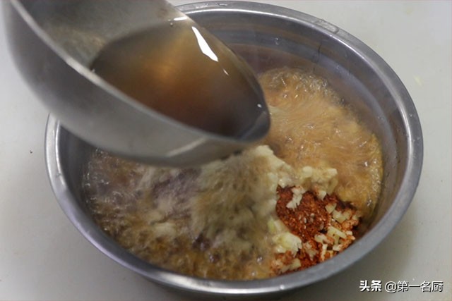 用筷子搅拌均匀,再浇入一半的热油,最后加入几滴白醋,提高辣椒油的香味。