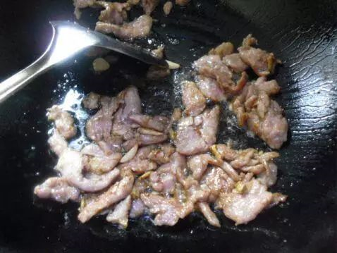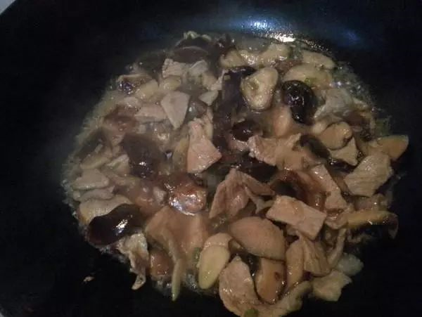 5.加入香菇,放盐,葱,酱油,蒜,胡萝卜,青椒,红辣椒炒熟,加入湿淀粉,味精翻炒