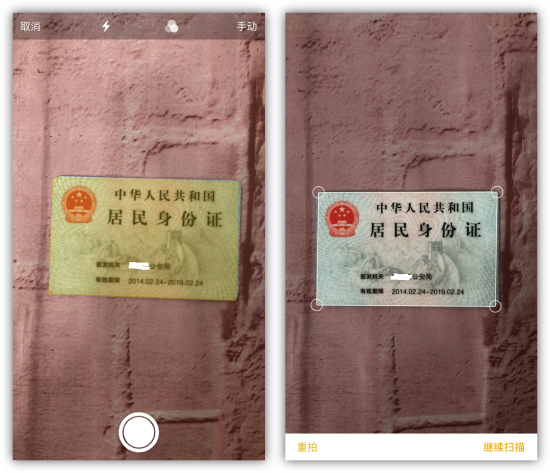 随后将镜头对准身份证正面,点击右上角可以切换自动和手动,屏幕上会出现黄色区域,可以自动识别,拍下后拖动边框调整范围,然后点击【继续扫描】。