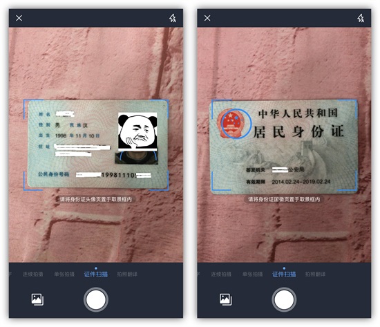 接下来会启动相机功能,按照屏幕上的提示,先将身份证头像页放在取景框中,对正后按下快门键;再将身份证国徽页放在取景框中,再次按下快门键。