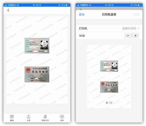 这样身份证就被扫描出来了,你可以点击【编辑】,裁剪身份证区域,而且还能添加专属水印,点击【分享】还能打印身份证,只需要将手机连接打印机即可。