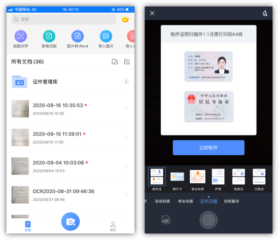 下面我教大家如何使用,先打开这个工具,然后点击底部的照相机按钮,这里有很多种识别功能,向右滑动找到【证件扫描】,然后点击【立即制作】按钮。