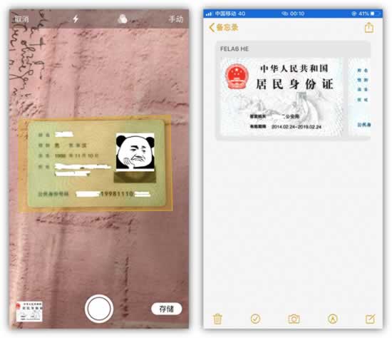 拍完正面再拍反面,按照上面的同样的方法,将身份证的正反两面扫描出来,然后点击右下角的【储存】,身份证就保存到备忘录中了,可以看到非常清晰!