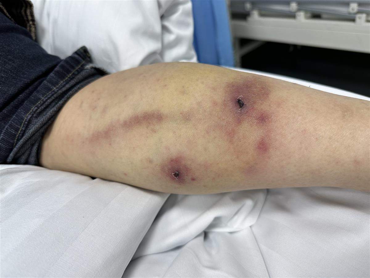 半个月前,48岁的丁女士突然感觉右小腿被什么东西咬了一下,又痛又痒,当天晚上,右小腿出现了两处暗红色斑疹,她就在药店买了一盒软膏自行涂抹,过了三四天,也没见明显好转,反而全身都出现了红疹。