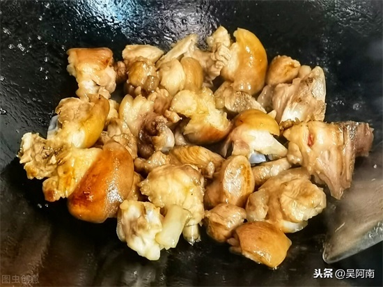 4.要想颜色看去红亮有光泽,可以焯水后炒下糖色上色,不过这个对厨房经验要求比较干,冰糖一定要小火慢炒,而且要不停地搅拌,直到冒泡炒至褐色后倒入猪蹄迅速翻炒即可;