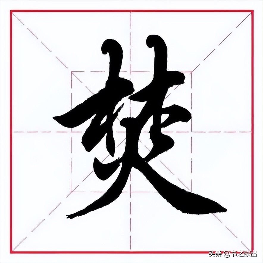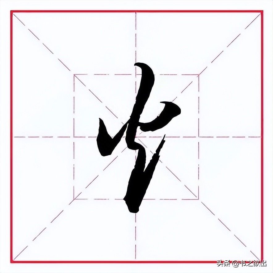 两个点笔左低右高,笔意相连,互相呼应。左点稍重,落笔后即向右上方挑笔出锋引带右点,右点为撇点,稍高、稍平,与左点呈合抱之势;竖撇高起,略带“屈头”,行笔勿重,从两个点笔中间穿过,过撇肚后向左稍弯快速撇出,力达撇尖;捺笔从撇画里面藏锋起笔,顺势向右下行,与撇笔对称,舒展飘逸,捺脚勿重。