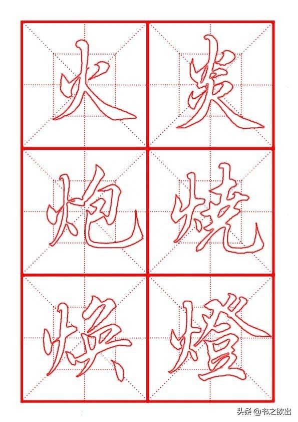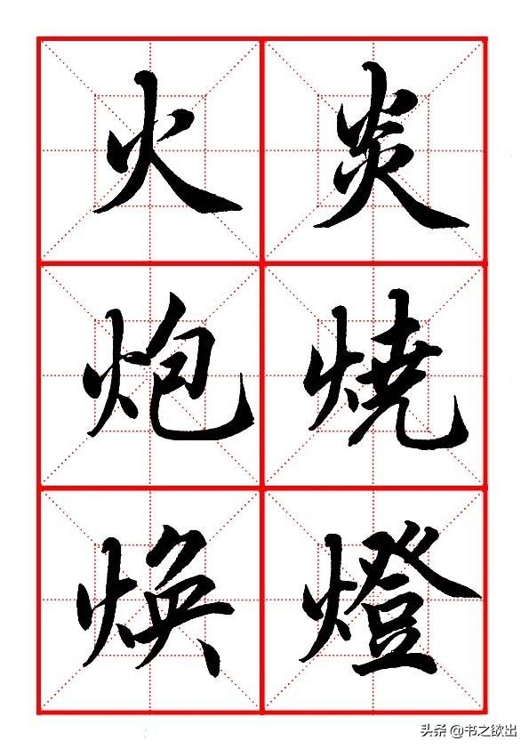 “火”字作为偏旁居字左时整体形窄,点笔收敛,捺笔简化为点,以让右部,竖撇出锋切忌过度向左;居下时不宜写高,左右开张以力托上部。此外,因行书书写的流畅性,“火”部的写法也具多样化(具体见后面字例),撇与捺可连写为一笔,更具草意,如下图: