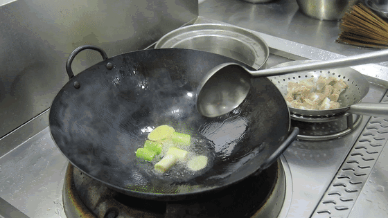 锅内烧油,油烧热后先把葱段和姜片放入锅中,小火爆香。等到小料炒香以后,倒入控过水分的排骨,转中火煸炒2分钟炒出排骨中的水分。等排骨也炒香以后,从锅边淋入适量清水。喜欢喝汤的朋友,水可以多加一些,然后转大火把水烧开。