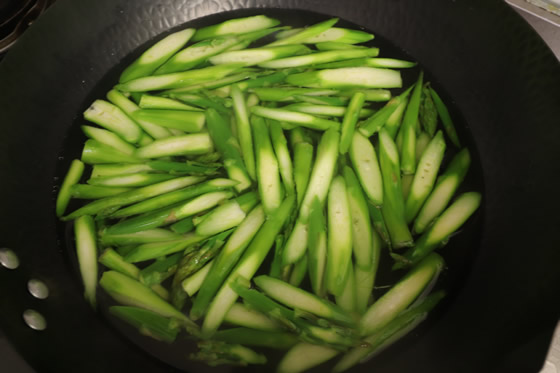 第二:锅中倒入适量的清水,大火烧开,然后再倒几滴油,放一点盐,加入切好的芦笋焯水,大约焯水三十秒捞出,然后过一遍凉水