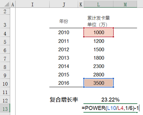 复合增长率=(期末值/期初值)^(1/n)-1 其中n是增长的年数
