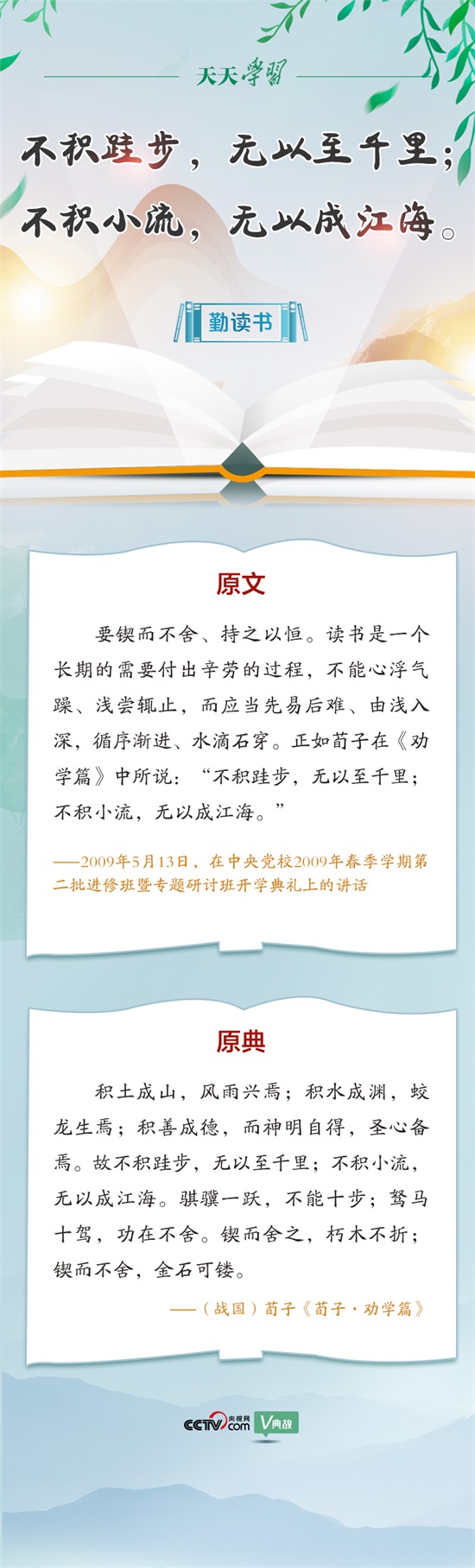 在这段话中,荀子以设喻引出论点:“积土成山,风雨兴焉;积水成渊,蛟龙生焉;积善成德,而神明自得,圣心备焉。”说明学习要注意积累。荀子不承认“天生圣人”的说法,认为人只要努力学习,“积善成德”,就可以具备圣人的思想。接着,他进一步申述道:“故不积跬步,无以至千里;不积小流,无以成江海。”古代称跨出一脚为“跬”,两脚为“步”,“跬步”形容很微小的距离。这句话是说,不积累一步半步的距离,就没有办法到达千里之远的地方;不积累细小的流水,就不可能汇聚成江河大海。这是从反面设喻来说明积累的重要性。经过这一正一反的设喻,学习要注意积累的道理便一目了然。