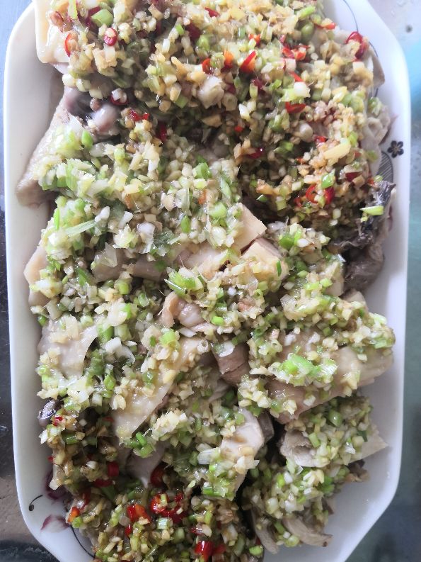 4、抹过芝麻油的鸡斩块放在盘子,分别浇上调好的姜葱油