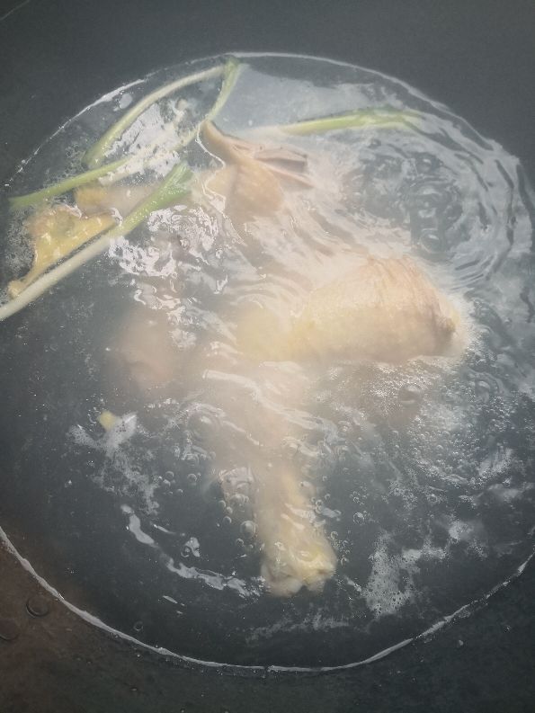 1、面糊发酵的时候,锅里放鸡,放没过鸡的水,姜葱;开火煮开,捞去浮沫转小火,再煮20分钟,捞出来放在冰水里浸泡二十分钟