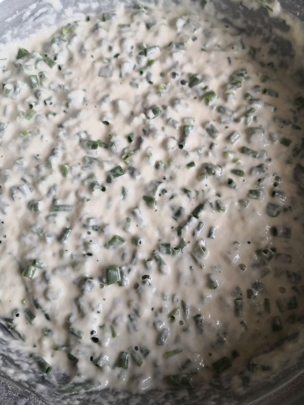 1、面粉加上盐、发酵粉、水,调成稀面糊