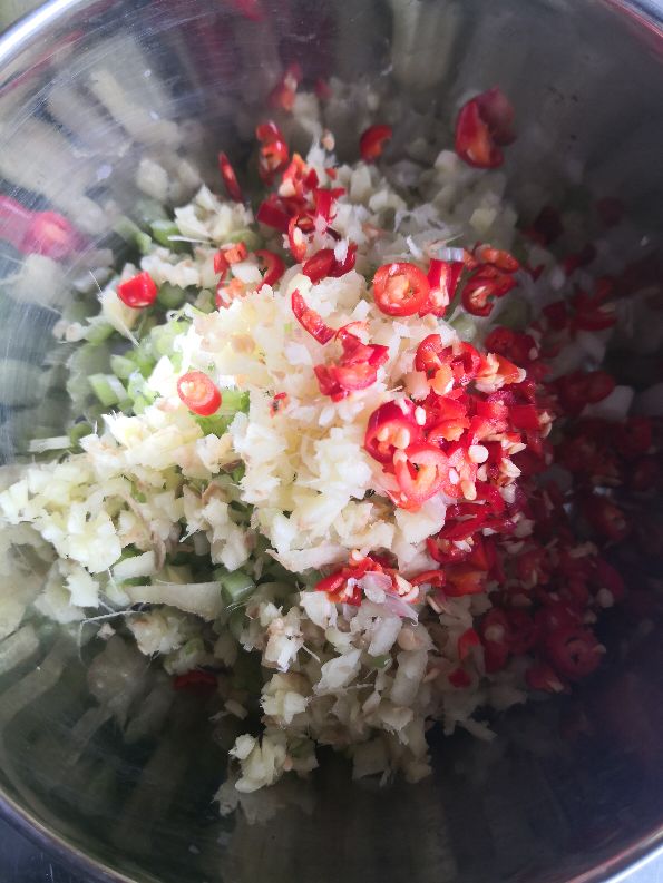 2、葱白、姜切碎,分成两个碗装好,在切几个小米椒放在其中一个碗里,两个碗里都放盐拌匀,葱油粑粑炸完后的热油,两个碗里各浇半勺,拌一下之后再浇半勺拌匀,放了小米椒的这个碗里加点生抽拌匀