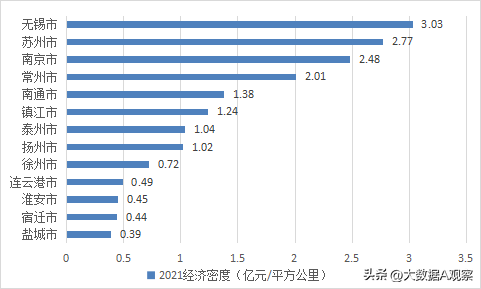 经济密度是单位面积国土上的经济总量。2021年江苏十三太保经济密度最高的是无锡市,3.03亿元/平方公里,苏州仅次于无锡,2.77亿元/平方公里,随后依次为南京,2.48亿元/平方公里,常州,2.01亿元/平方公里,南通,1.38亿元/平方公里,镇江,1.24亿元/平方公里,泰州,1.04亿元/平方公里,扬州,1.02亿元/平方公里,徐州,0.72亿元/平方公里,连云港,0.49亿元/平方公里,淮安,0.45亿元/平方公里,宿迁,0.44亿元/平方公里,盐城最低,0.39亿元/平方公里。