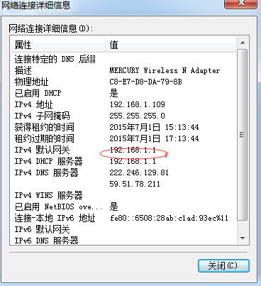 1、 无线路由器要更改后台管理密码的话,建议用网线连接电脑。成功连接电脑后查看获取的默认网关IP。