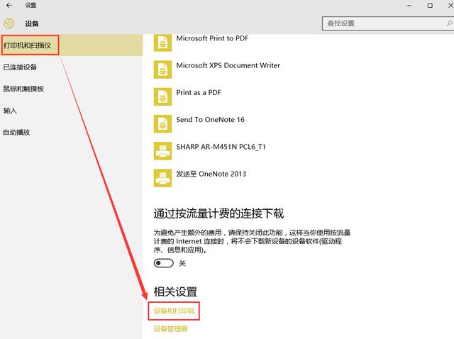 2、设备设置中的第一项就是打印机和扫描仪,点击如下图所示的地方。