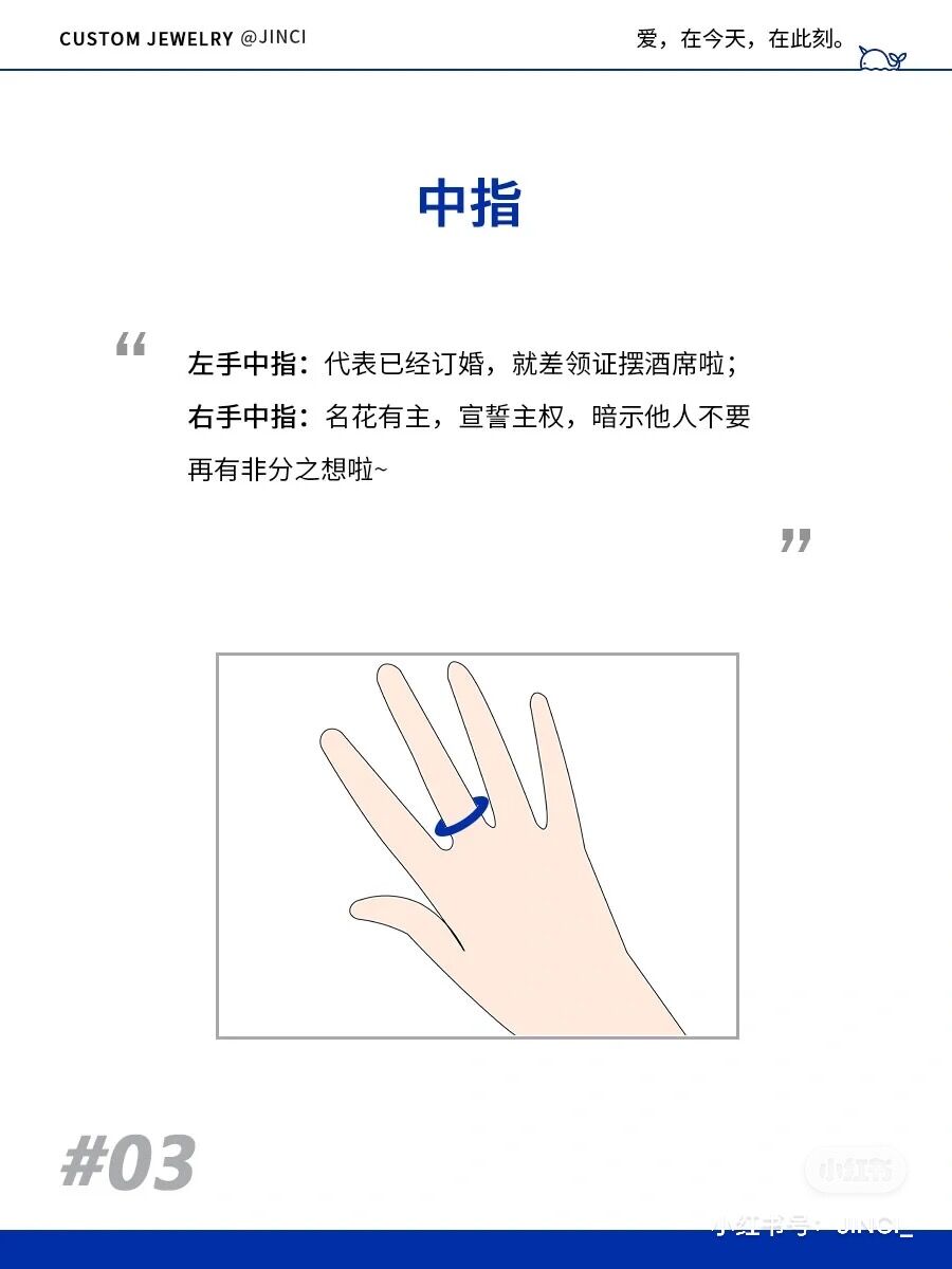 左手中指:代表已经订婚,就差领证摆酒席啦。