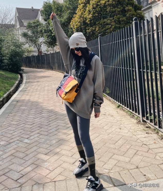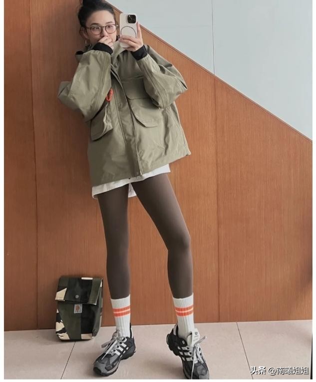 骨架宽大的女生身材并不挂肉,但是骨骼感很明显,所以穿搭长款外套可以优化整体纵向的比例。穿搭瑜伽裤可以衔接长袜,做好深色系瑜伽裤和浅色鞋子的颜色过渡,只露出小腿的穿法,也特别时尚。